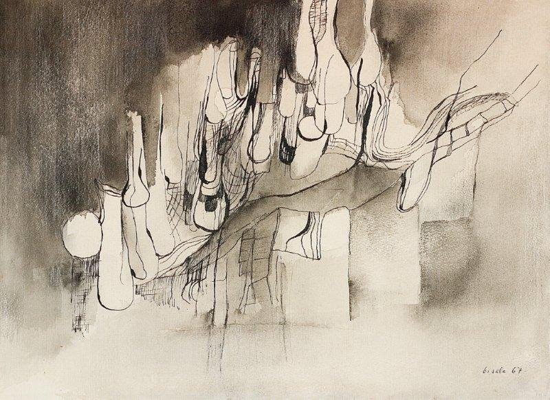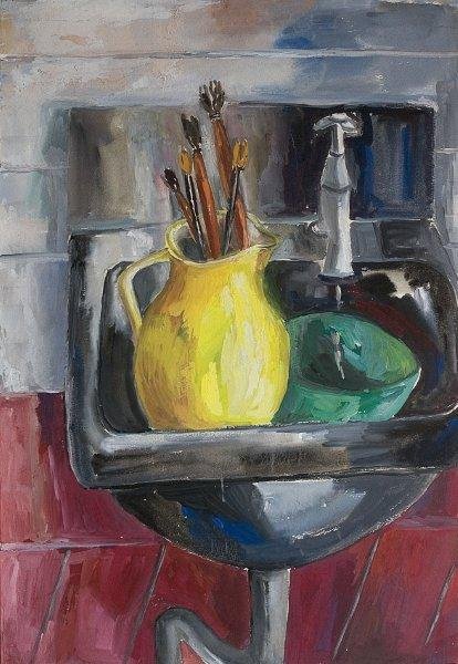 Jarra com pincéis e tigela numa pia , 1947